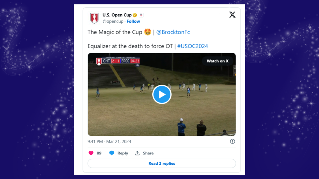 From Brockton FC Facebook Post: November 19, 2023: Dramatic win by Brockton last night in New York. The team beat Pancyprian Freedoms.1-3 in the US Open Cup Final Qualifying round with all goals scored after the 90 minutes. Brockton qualified to the Lamar Hunt US Open Cup for the second time in its history. Watch the game highlights in the link below.