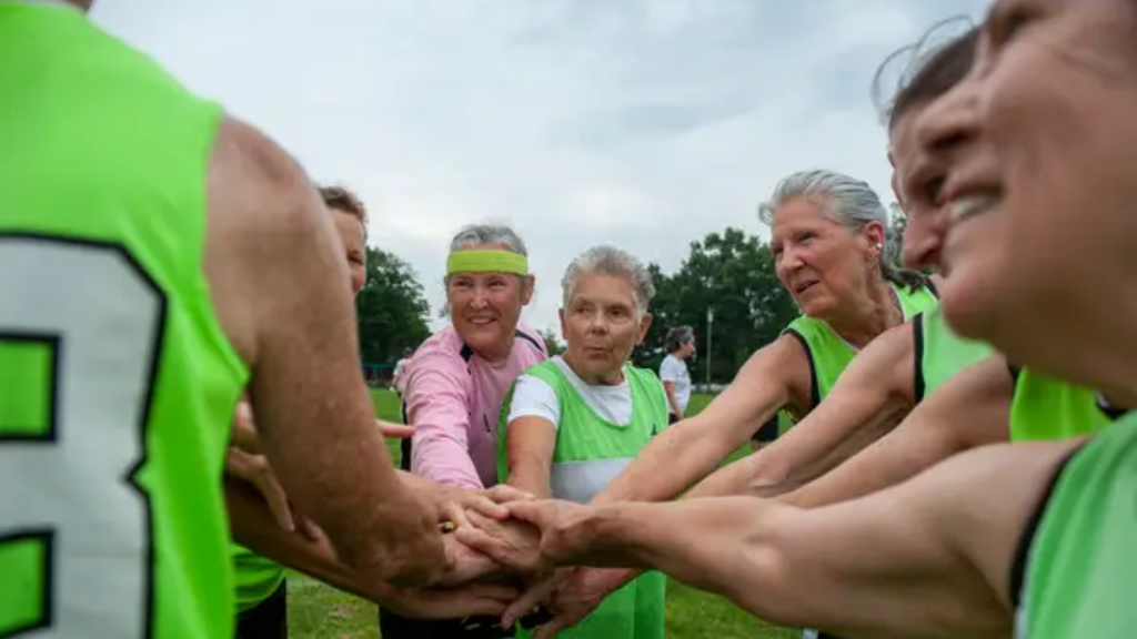 Bay State Breakers "bring it in" at practice for women over 50 with some in their 70s at the Brophy School in Framingham, July 21, 2023. The women's over 65 team made it to the championship game. The women's over 70 team won the championship for the second year in a row at the USASA Soccer Fest, a national over-30 tournament in Greensboro, NC. Pictured at center are Chris Matson, of Belmont, Rita Wilkie, of Milford, and Ann Finnerty, of Jamaica Plain.