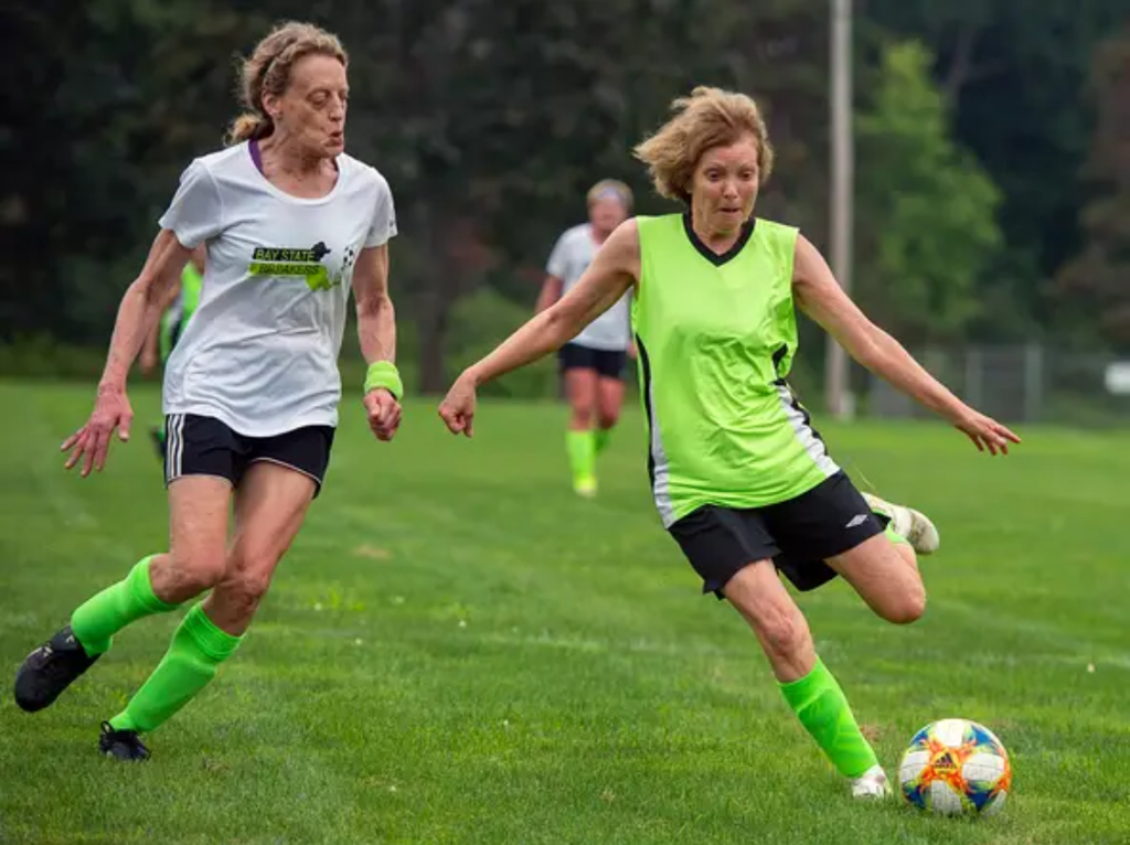 Dianne Baskind, of Framingham, pursued by Sue Zimmermann, of Lexington, at a Bay State Breakers practice for women over 50 with some in their 70s at the Brophy School in Framingham, July 21, 2023. The women's over 65 team, which Baskind is a part of, made it to the championship game. The women's over 70 team won the championship for the second year in a row at the USASA Soccer Fest, a national over-30 tournament in Greensboro, NC.